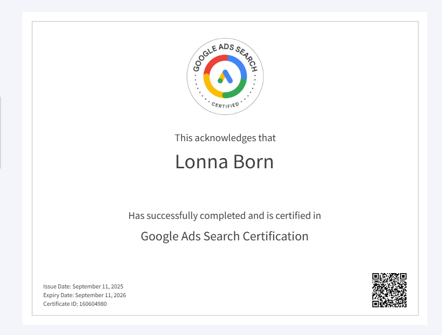 This has been one of the most valuable experiences of my continuing education journey. I appreciate the real-world tools that we are exploring and putting to use. I recently completed my completed Google Ads Search and Google Display Ads Certifications. I look forward to using these tools to grow my two businesses.
