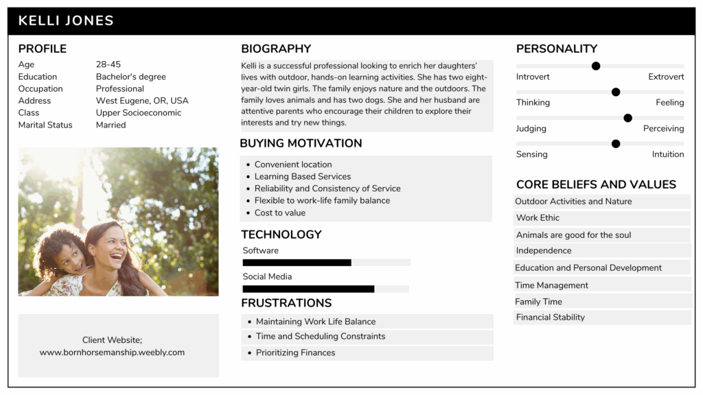 I really enjoyed reading through your persona for BornHorsemanship.weebly.com—what an awesome business! I have a close family friend who travels to participate in various horse-riding shows. I’ll admit I don’t know much of the terminology, but I’ve seen firsthand how passionate and dedicated she is, and your persona reminded me of her right away 😊. She is young and has been riding for a long time, but her passion for horses is so special.