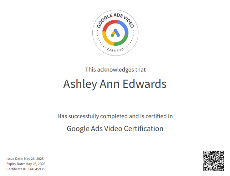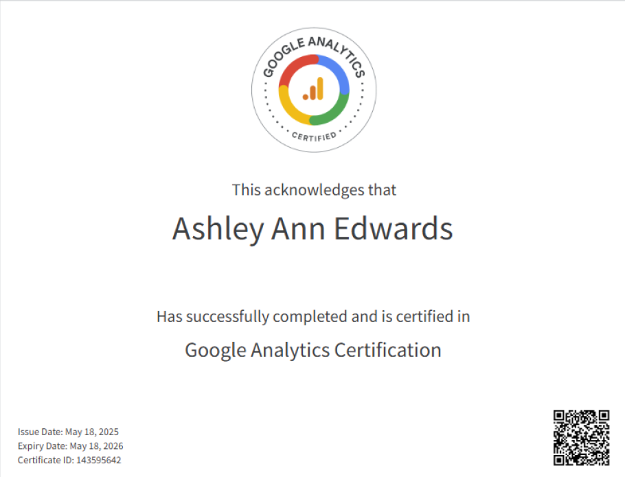 Ashley Ann Edwards holds multiple industry-recognized certifications in digital marketing and analytics. Ashley Ann’s current credentials include the following. Click on each certification below to view the Credential Verification: