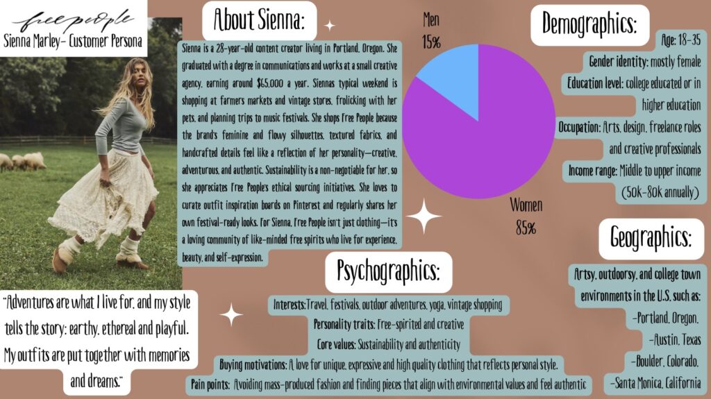 I really liked your Persona for Sienna Marley! The design is creative and fits the Free People brand really well. The lifestyle details you included, like going to festivals and shopping vintage, made her feel easy to picture as a real customer. I also thought her psychographics were strong and lined up with the brand’s image of freedom and creativity.